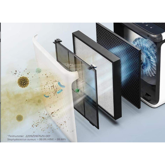 Druhú vrstvu tvorí H13 True HEPA filter s technológiou HEPASmart™. Vylepšené staticky nabitými vláknami, ktoré zachytia najmenej 99,97% častíc prenášaných vzduchom o veľkosti 0,3 mikróna, ako je jemný prach, častice dymu, pleseň, baktérie, peľ, dymové častice, roztoče a zvieraciu srst. To odlišuje Levoit od konkurencie, pretože HEPA H13 filter je oveľa kvalitnejšie a spoľahlivejšie ako bežne používané filtre. Nezávislé testovanie 220923107GZU-001.