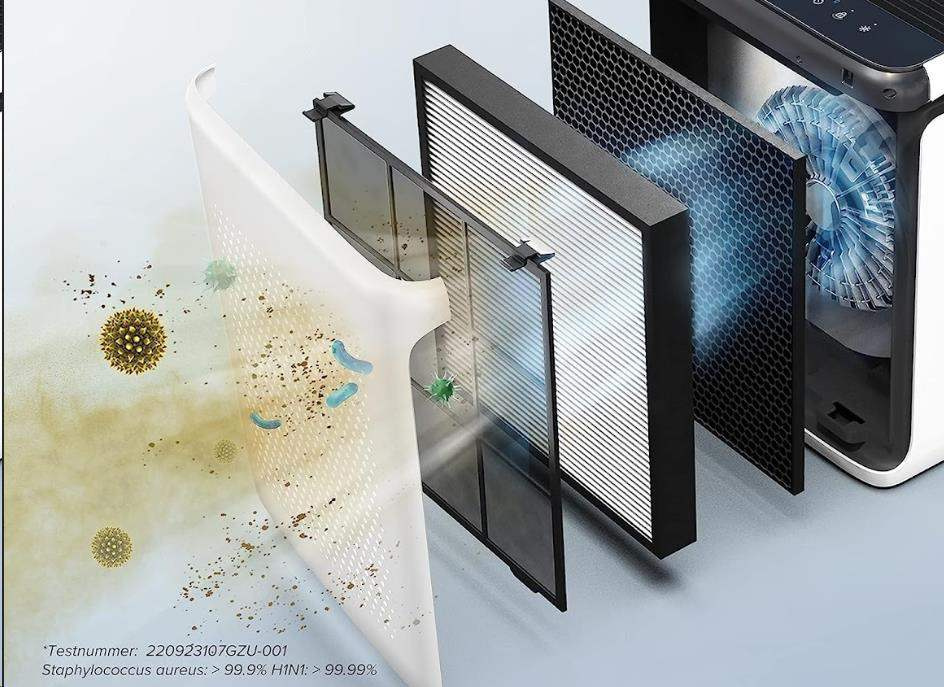 Druhú vrstvu tvorí H13 True HEPA filter s technológiou HEPASmart™. Vylepšené staticky nabitými vláknami, ktoré zachytia najmenej 99,97% častíc prenášaných vzduchom o veľkosti 0,3 mikróna, ako je jemný prach, častice dymu, pleseň, baktérie, peľ, dymové častice, roztoče a zvieraciu srst. To odlišuje Levoit od konkurencie, pretože HEPA H13 filter je oveľa kvalitnejšie a spoľahlivejšie ako bežne používané filtre. Nezávislé testovanie 220923107GZU-001.