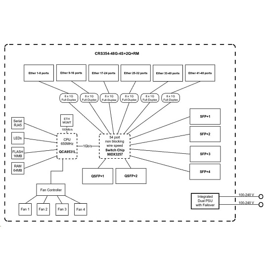 model CRS354-48P-4S+2Q+RM je mimoriadne funkčný a má najlepšiu cenu na trhu - bude dokonalým doplnkom profesionálnej zostavy. Celková neblokujúca priepustnosť je 168 Gb/s, prepínacia kapacita je 336 Gb/s a rýchlosť presmerovania dosahuje 235 Mpps Technické specifikace: