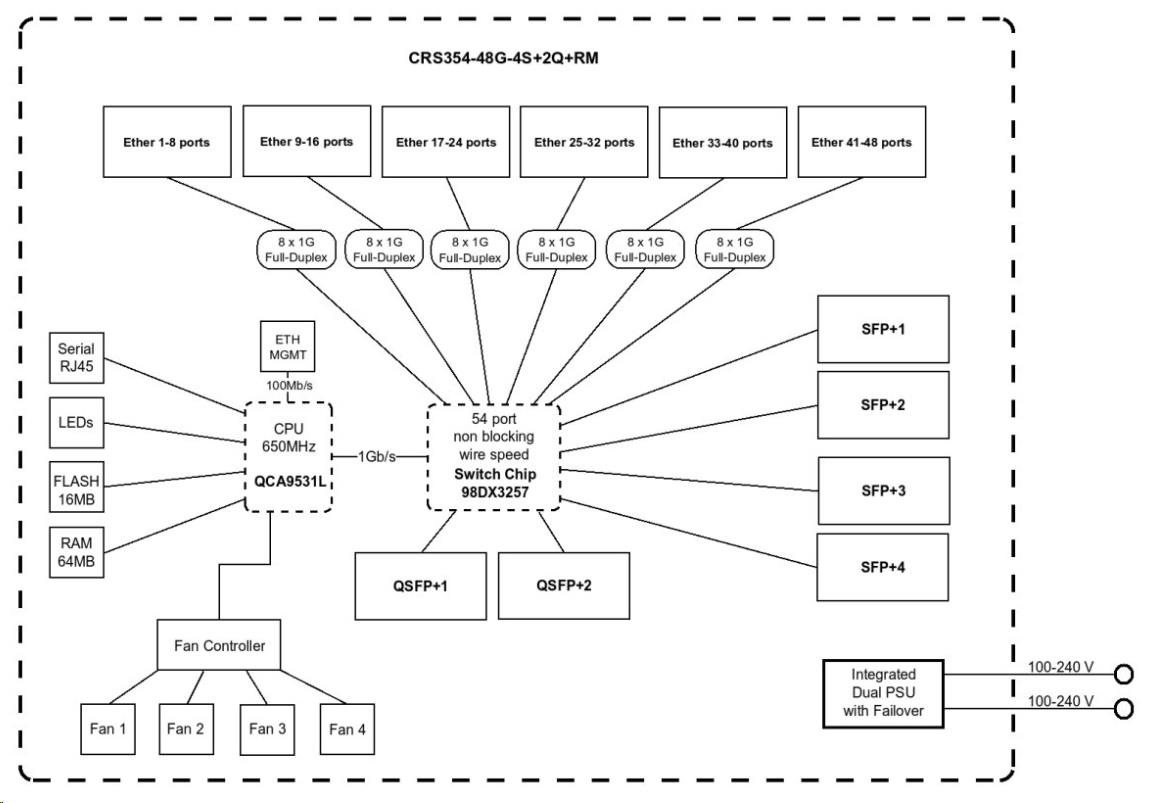 model CRS354-48P-4S+2Q+RM je mimoriadne funkčný a má najlepšiu cenu na trhu - bude dokonalým doplnkom profesionálnej zostavy. Celková neblokujúca priepustnosť je 168 Gb/s, prepínacia kapacita je 336 Gb/s a rýchlosť presmerovania dosahuje 235 Mpps Technické specifikace: