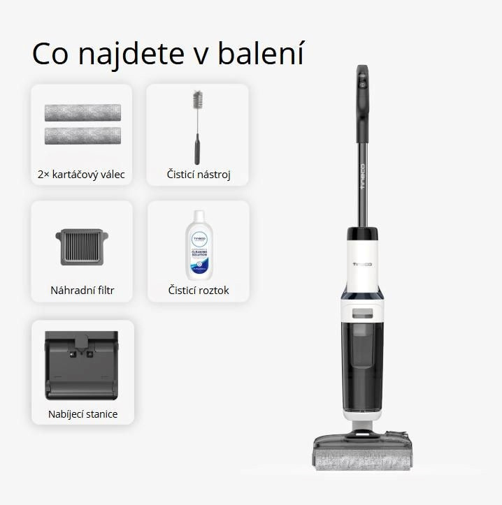 Súčasťou balenia je originálny čistiaci roztok Tineco DeoClean Solution, ktorý zvyšuje účinnosť upratovania – najmä pri silne znečistených miestach.