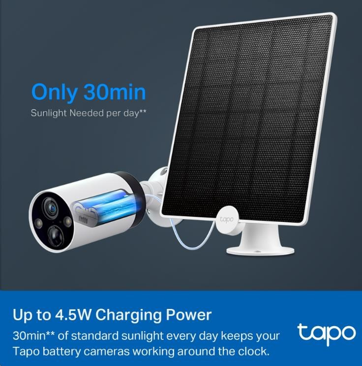 - Non-Stop Solar Power-Zachytáva bezplatnú, čistú slnečnú energiu a poskytuje nepřetržité napájanie pre vaše kamery Tapo napájané batériami (Tapo C425, Tapo C420), aby vás chránili po celý rok.