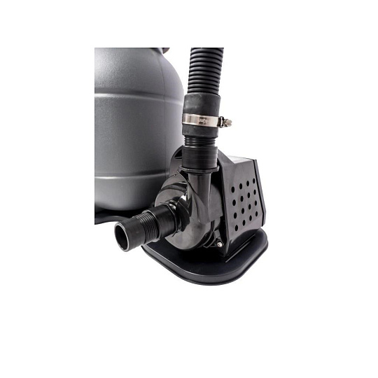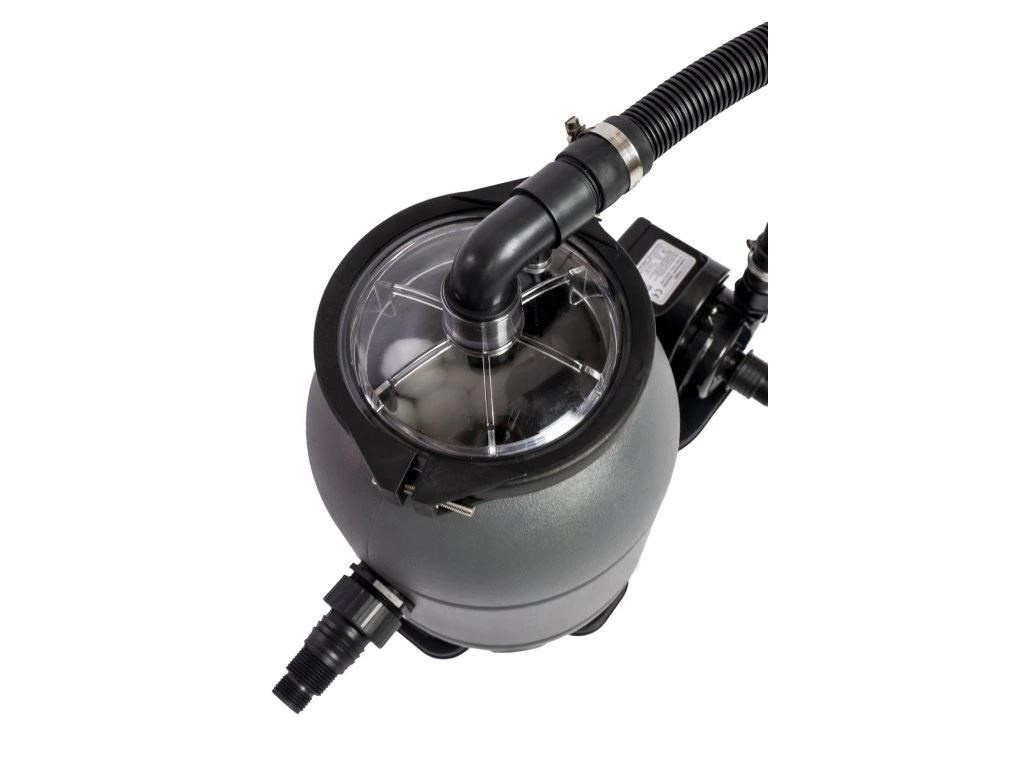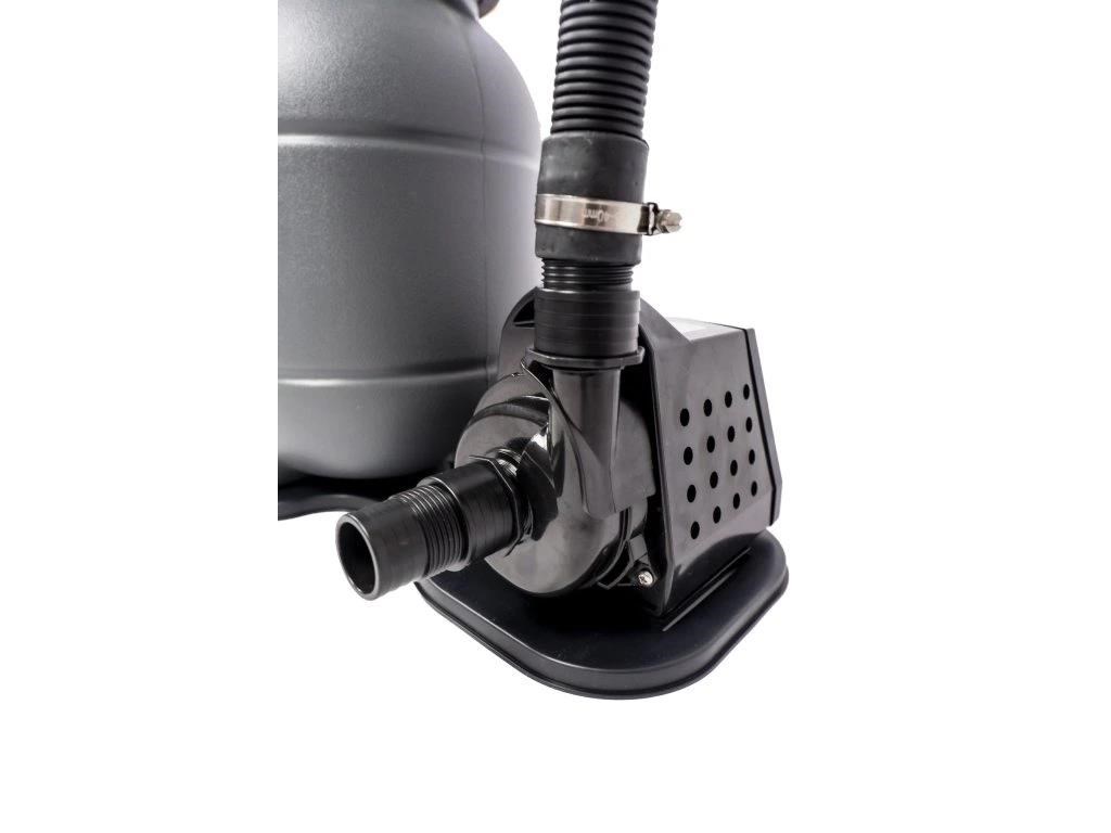 Filtrační nádoba je vyrobena z odolného polypropylenu, který nepodléhá korozi, odolává UV záření i běžné bazénové chemii. Stabilní základna s otočným zámkem zajišťuje bezpečné uchycení filtrační nádoby a dlouhou životnost celého systému.