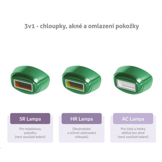 Epilátor TrueLife BELLE IPL E3 môžete využiť okrem samotnej epilácie aj na ďalšie aplikácie. Stačí len vymeniť lampu. K dlhodobému a účinnému odstráneniu chlpov poslúži HR lampa, ktorá je súčasťou balenia. Mnohých trápia akné. Ak chcete mať tvár čistú a jemnú na dotyk, odporúčame si zaobstarať AC lampu. Ak chcete svoju pleť omladiť, pomôže vám s tým SR lampa.