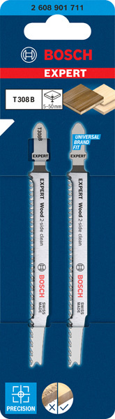Veľmi čistý rez horný aj spodný pás - Zabezpečiť, aby na viditeľnej časti obrábaného materiálu bola „čistá strana rezu“, bolo medzi stolármi a tesármi vždy umenie. Niekedy môžete obrobok otočiť, inokedy je možné držať priame rezacie píly obrátené hore nohami. Alebo môžete použiť plátok EXPERT Wood 2-side clean, ktorý vďaka dvom radom zubov ponúka dokonalý rez bez otrepov na oboch stranách. Vynaliezavá konštrukcia týchto pílových plátkov pre priame píly znamená, že po reze už nie je potrebná žiadna ďalšia práca – zuby zabraňujú otrepu materiálu pri zdvihu aj pri sestupe pily. To je ideálne pre profesionálov, ktorí chcú ušetriť čas a zároveň poskytovať svojim klientom prácu najvyššej kvality. S veľmi ostrými a presne brúslenými zubami je pílový plátok Bosch EXPERT Wood 2-side clean vhodný na rezanie mäkkého dreva do hrúbky 50 mm. Nábytkári môžu získať dokonalý povrch a neztrácať čas brúsením po každom reze priame píly. K dispozícii pre rovné rezy (T308B), pre krivkové rezy (T308BO) a pre presné uhlové rezy (T308BP). Kompatibilný so všetkými pílami s upínaním do T