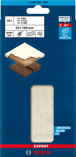 Až 4× snížená prašnosť než s brusným papírom Bosch C420 - Veľkým nepriateľom brúsenia je prach. Zanášajú brúsny papier a znižuje jeho efektívnosť. Zopracováva všetko v miestnosti a šíri sa aj ďalej do domu. Preto sme prišli s technológiou Bosch Particle Control a posunuli sme znižovanie prašnosti na novú úroveň. Technológia Bosch Particle Control zabezpečuje nasávanie všetkých prachových častíc do vysávača alebo filtra. Hneď v „prvej línii“ systému stojí brúsna mriežka Bosch EXPERT M480: Častice prechádzajú priamo jej otvorenou sieťou, takže nezanáša povrch ani neznečisťuje vzduch. Vďaka tomu je tiež vysoko efektívna a má extrémne dlhú životnosť. Zníženie prašnosti pri brúsení nie je ľahké, ale našli sme riešenie. Táto brúsna mriežka Bosch EXPERT M480 využíva našu technológiu Particle Control, ktorá znižuje prašnosť na minimum. Stačí len prichytiť suchým zipsom