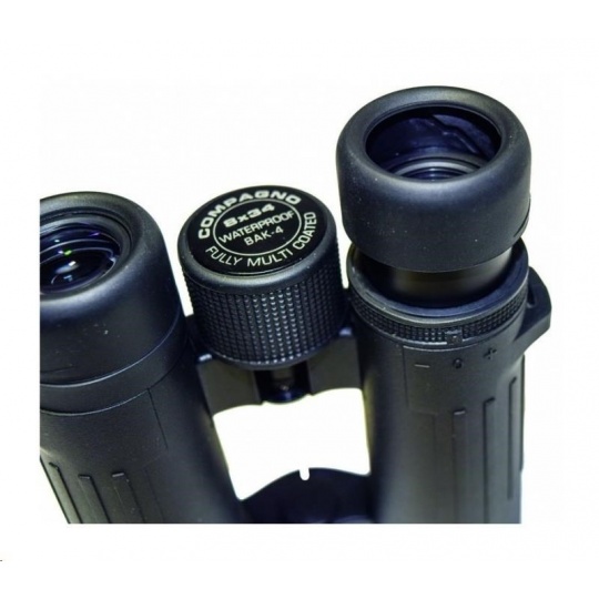 Kompaktný ďalekohľad COMPAGNO 10x34, zväčšenie 10x, predná šošovka 34mm, zorné pole 106m, ostré od 4m, optický výstup 3,3mm, vzdialenosť stredov očí 56-74mm s odstupom 16,0mm, svetelnosť 10,9, stmievateľnosť 18,4, rozmery 130x126x45 mm, hmotnosť 450g, čierny. Kompaktné ďalekohľady DCF so strešnými hranolmi BaK4 - ROOF (DACH). Modelová rada s moderným dizajnom, malými rozmermi, nízkou hmotnosťou a vysokou optickou kvalitou pre kontrastný pohľad aj za zhoršených svetelných podmienok. Výkonný a odolný ďalekohľad s Fully Multicoated úpravou, hranoly z BaK4 skla, vodotesný do 0,5m/15min s ochranou proti zahmievaniu plnením dusíkom, vhodný aj na sledovanie s okuliarmi, nastavenie +/-4 dioptrií, výsuvné krytky okuláru, statívový závit, pogumované telo z ABS. Vrátane textilného puzdra, popruhu a čistiacej utierky. Malý, no maximálne výkonný ďalekohľad do vrecka na turistiku.