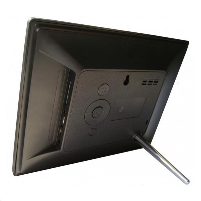 Digitálny fotorámik s uhlopriečkou 8", LED podsvietenie, rozlíšenie 1024x768px, pomer 4:3, prehliadanie obrázkov JPEG, počúvanie hudby MP3 a prehrávanie videa HD 720p, multislot SDHC/MS, USB2 pre FlashStick, mini USB2, Audio out, IR diaľkový ovládač, farba: čierna. Auto Start, OSD menu, SlideShow, Zoom, otáčanie obrázkov, kontrast/ svetelnosť/ farebnosť, budík, hodiny, kalendár. TFT LCD, uhlopriečka 20,3cm, svetelnosť 300 cd/m2, kontrast 300:1. Formáty Foto: JPEG, MBP, GIF, TIP, PNG - Video: MPEG 1/2/4 (Divx4.0/5.0, Xvid), AVI, M-JPEG, MKV, WMV, ASF, MOV, MP4, H.264, 3GP - Audio: MP3, WMA, OGG, AAC, APE, FLAC, WAV. Možnosť upevnenia na stenu alebo našroubovanie stojánka, výstup slúchadiel, sieťový zdroj AC/DC 5V/1,5A, rozmery: 220x176x23 mm, hmotnosť 440 g.