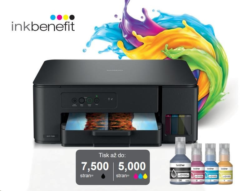 Kompaktná tlačiareň 3 v 1 DCP-T230 tlačí dlhšie s atramentovými fľaštičkami s super vysokou výťažnosťou, čo znižuje náklady na farebnú stránku. Rýchlo naplňte nádrže za niekoľko sekúnd, bez toho, aby ste museli držať fľaštičky. Doplňovanie atramentu je jednoduché a bez rizika rozliatia. Inovatívny systém zámku fľaštičiek zabezpečuje, že vždy doplníte správnu farbu.