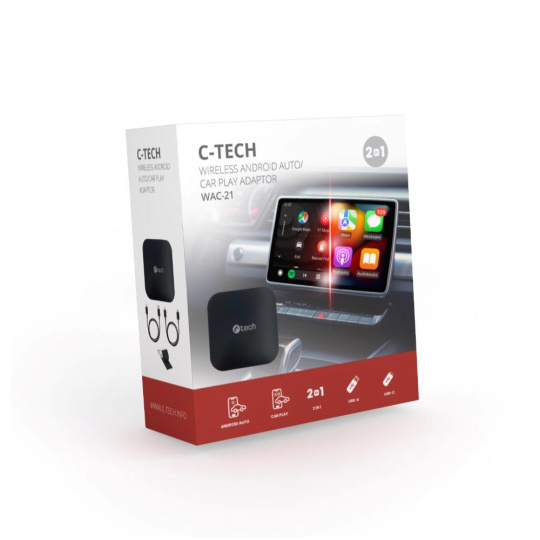 Užívajte si úplnú slobodu a pohodlie so zlučovacím adaptérom C-TECH WAC-21, ktorý umožňuje jednoduché prepojenie vášho vozidla bezdrôtovými verziami Android Auto aj Car Play. Tento jedinečný adaptér kombinuje funkcie pre obe platformy, čo znamená, že nezáleží na tom, aký telefón máte – vždy si vychutnáte prístup k obľúbeným funkciám, aplikáciám a službám priamo na obrazovke palubnej dosky vášho vozidla.