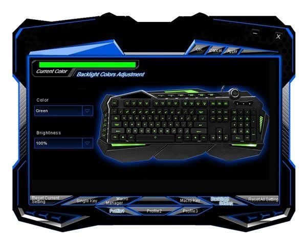 3 profily - na klávesnici nájdete tlačidlá na prepínanie medzi 3 nezávislými profilmi. Pre každý profil môžete individuálne nastaviť farbu podsvietenia, jeho intenzitu, makrá a preddefinované klávesy...