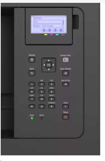 | Konzola | 5-riadkový LCD, 5 LED diód (Online, Pripravené, Správa, Úloha a Šetrič energie), Tlačidlá, 10-klávesová numerická klávesnica |
