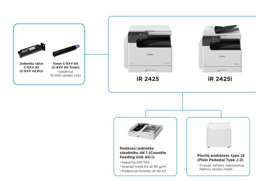 | Prídavný podávač papiera AK1 | Kapacita papiera: 1×250 listov (80 g/m2) Typ papiera: bežný, recyklované, farebné, perforované Veľkosť papiera: A3, A4, A4R, A5, B4, B5, B5R Hmotnosť papiera: 64 až 90 g/m2 Zdroj napájania: z hlavnej jednotky Rozmery (š × h × v): 581 × 575 × 92 mm Hmotnosť: cca,8 kg |
