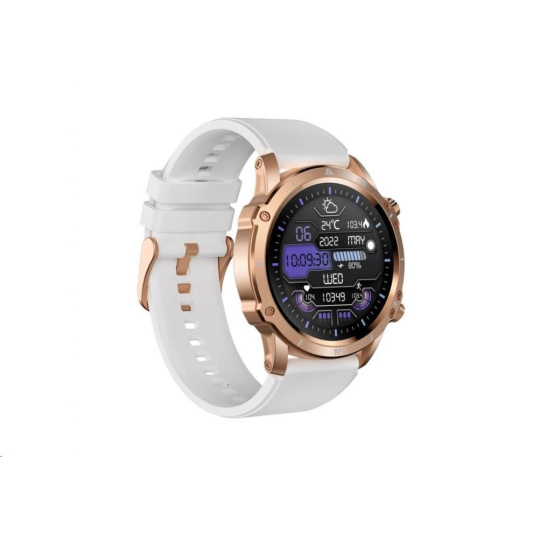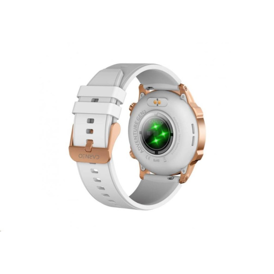 Moderné outdoorové fitness hodinky CARNEO ADVENTURE HR+ druhej generácie v zlatoružovej farbe s bielym, na dotyk veľmi príjemným silikonovým remienkom a farebným SUPER AMOLED displejom s vysokým jasom a funkciou trvalého zobrazenia času monitorujú vašu dennú aktivitu, úroveň stresu, ale je možné ich spárovať s mobilným telefónom a upozorniť vás na prichádzajúci hovor alebo SMS. Hodinky umožňujú telefonovať, aniž by ste museli vybrať telefón z tašky, vďaka vstavanému mikrofónu a reproduktoru až do vzdialenosti 10 m od telefónu. Ich bezchybné kovové telo s nadčasovými outdoorovými krivkami je tak návykové, že ich po prvom nosení nebudete chcieť sundávať zo zápästia. Extrémne odolné sklo Gorilla glass ochráni ich krištáľovo čistý displej pred poškriabaním.