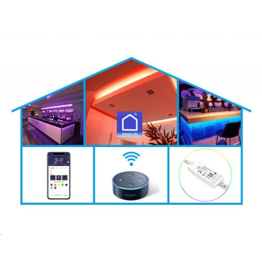LED pás Carneo Smartlight RGBW Wifi je 5m dlhý flexibilný samolepiaci pás, osadený celkovo 240ks LED diód s plnofarebným svetelným spektrom RGB a teplým bielym svetlom. Farbu a intenzitu svetla si môžete regulovať buď pomocou mobilnej aplikácie SmartLife alebo systémov inteligentného ovládania domácnosti Amazon Alexa alebo Google Home. Aplikácia je kompatibilná s zariadeniami Android vo verzii 4.0 a vyššej a tiež s zariadeniami iOS vo verzii 8.1 a vyššej. Led pásik sa ovláda pomocou technológie WIFI, preto je potrebné ho pripojiť do vašej domácej Wifi siete.