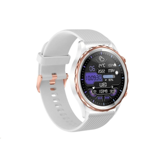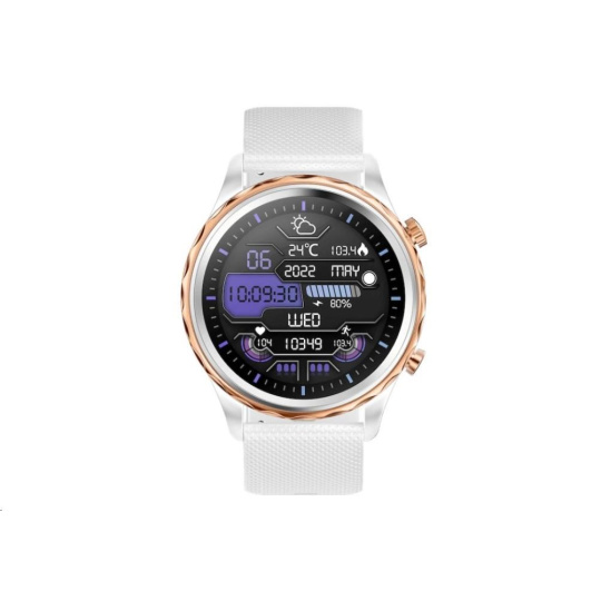 Moderné outdoorové fitness chytré hodinky Carneo Queen HR+ v elegantnej bielej farbe so striebornou korunkou z nehrdzavejúcej ocele majú kruhový farebný displej SUPER AMOLED chránený tvrdým minerálnym sklom. Umožňujú meranie srdcového tepu, stresu, BMI, najetých vzdialeností, monitorovanie spálených kalórií či kvality spánku. Obsahujú 380mAh batériu s výdržou až 5 dní. Podľa certifikácie IP67 sú odolné voči vode a prachu. Sú kompatibilné s operačným systémom iOS a Android. Hodinky majú na dotyk príjemný silikónový remienok v čiernej farbe, ktorý je možné vymeniť za remienok v inej farbe alebo kožený či kovový, čím môžete zmeniť športový vzhľad hodiniek na manažérsky. Vkusný outdoorovo-luxusný dizajn sa ľahko kombinuje s oblekom alebo voľnočasovým outfitom. Hodinky aj aplikácia sú kompletne v češtine, takže si budete určite rozumieť.
