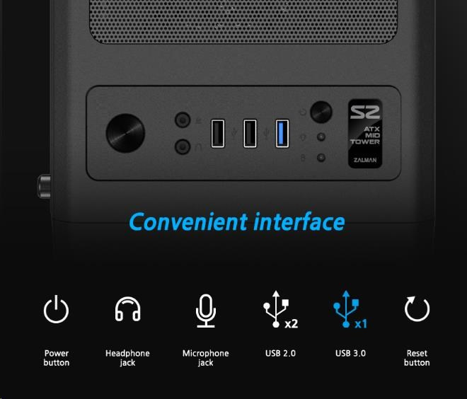 case Zalman miditower S2, ATX/mATX/Mini-ITX, bez zdroje, USB3.0, černá