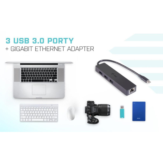 Kombinuje pasívny rozbočovač HUB s adaptérom Gigabit Ethernet na jednoduché a rýchle pripojenie obľúbených zariadení USB k notebooku, tabletu, počítaču alebo smartfónu s novým rozhraním USB-C alebo Thunderbolt 3 a na vysokorýchlostný prístup k sieti a internetu prostredníctvom portu Gigabit Ethernet. HUB ponúka tri USB 3.0 portov s funkciou Plug & Play a štandardným nabíjaním USB - automaticky rozpozná, či je pripojené nabíjacie zariadenie USB. USB 3.0 je dôležitý najmä pri prenose dát z pamäťových kariet USB a flash diskov, kde je jeho vysoká prenosová rýchlosť najužitočnejšia.