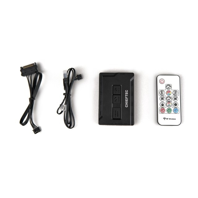 | Scope of delivery | Set of screws, instruction manual, remote control, RGB control hub (DF-908) with 3PIN +5V M/B Sync and SATA power cable Front: 3x 120mm A-RGB rainbow fans pre-installed Rear: 1x 120mm A-RGB rainbow fan pre-installed |