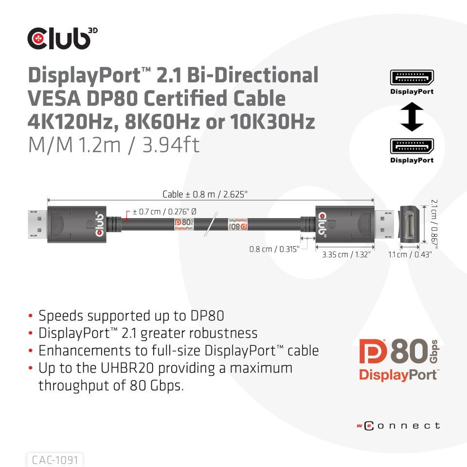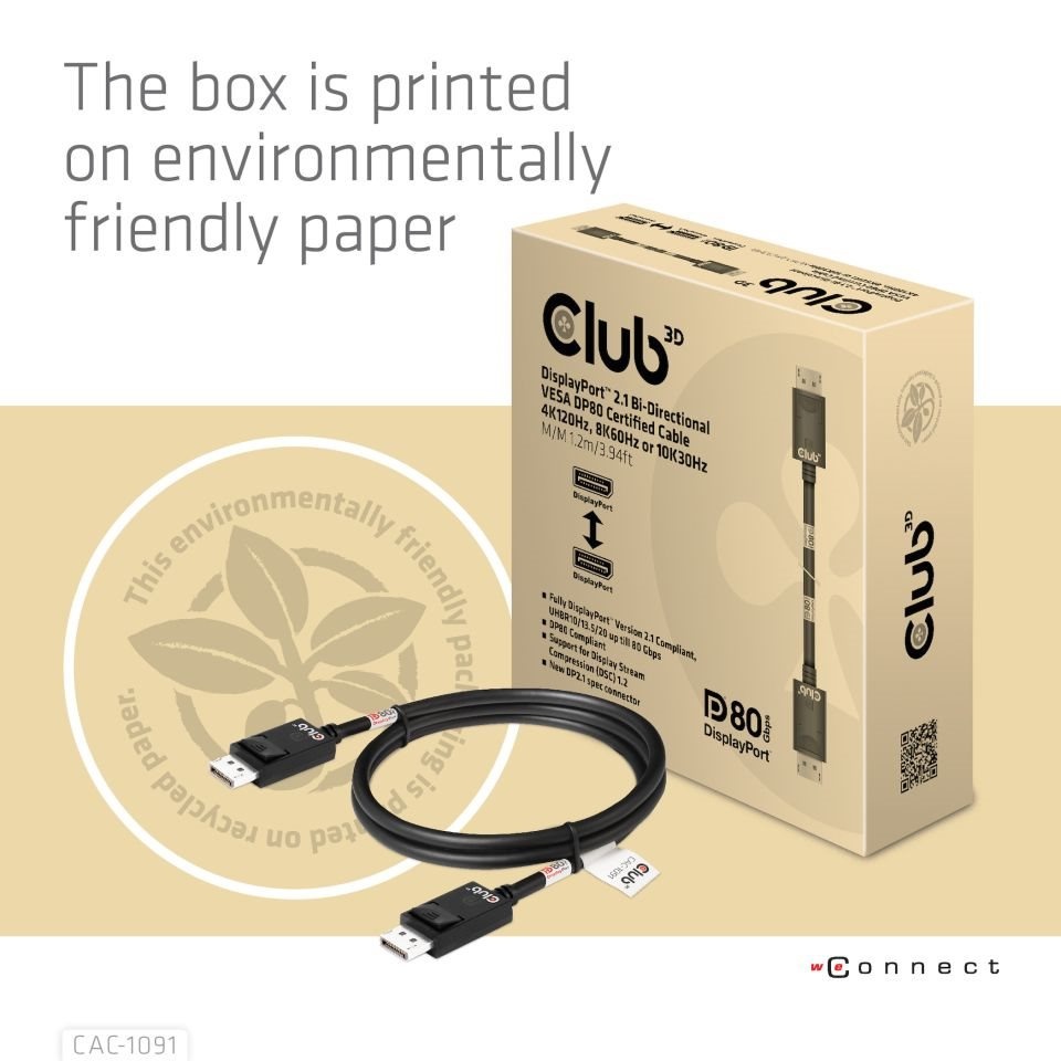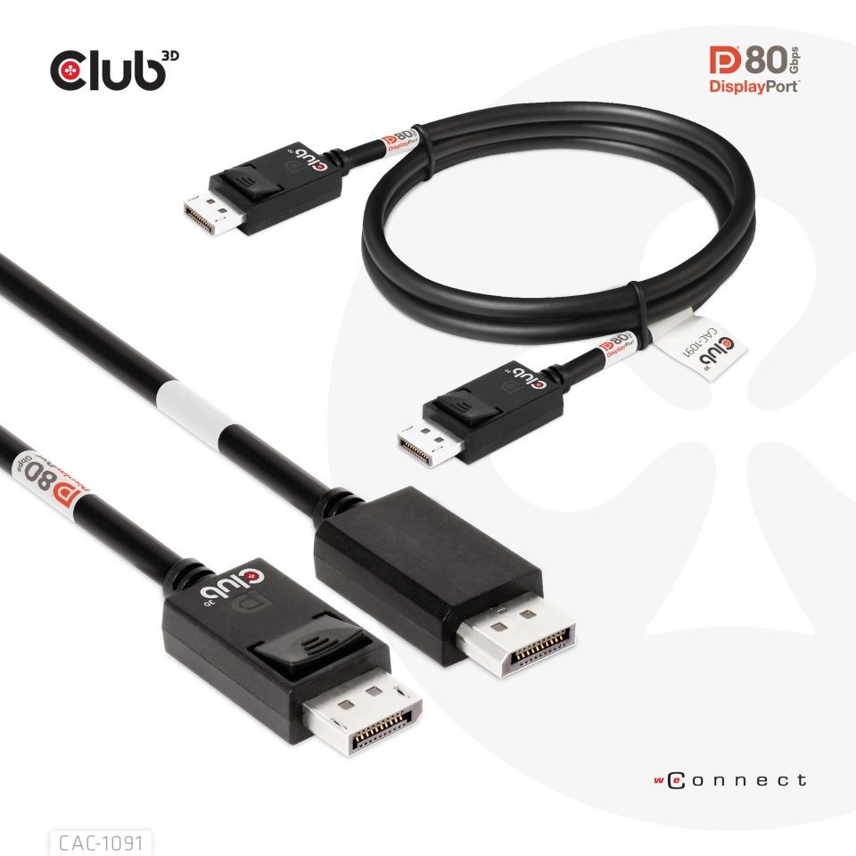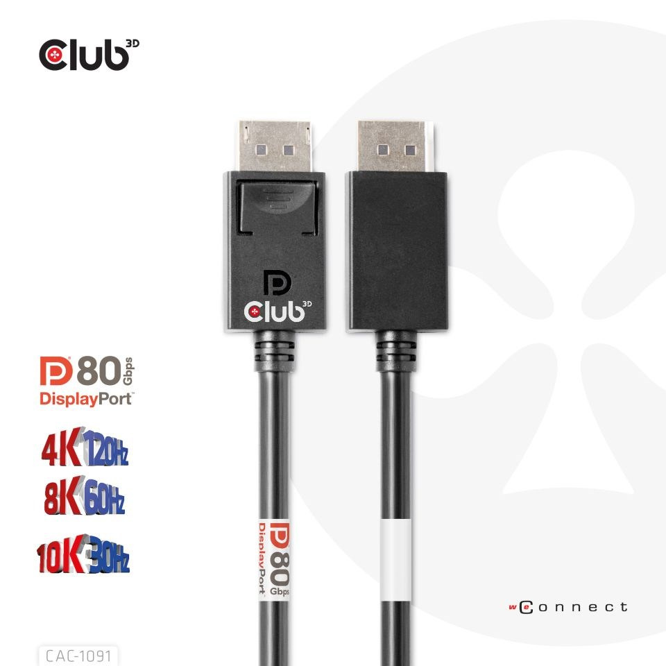 Kábel Club 3D CAC-1091 DisplayPort™ 2.1 umožňuje pripojenie vášho (herná) PC alebo notebooku s podporou DisplayPort™ k (Ultra) monitoru s vysokým rozlíšením alebo inému zariadeniu s podporou DisplayPort™. DisplayPort™ 2.1 UHBR10/13.5/20 až 80 Gb/s, má tiež podporu pre Display Stream Compression 1.2 (DSC), Forward Error Correction a rozširuje maximálny počet vložených audio kanálov na 32. Disponuje zamykateľnými konektormi DisplayPort™ zabezpečujúcimi bezpečné, spoľahlivé spojenie, s NOVÝMI kontaktnými prstami špeciálne navrhnutými pre tieto vysoké rýchlosti. Jednoducho stlačte zabudované jednodotykové tlačidlo na odomknutie konektora. Mäkký plášť UltraFlex chráni kábel pred ohybom a poškodením deformáciami.