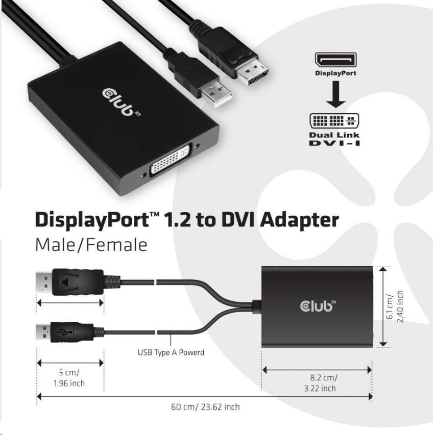 Club3D Aktívny adaptér DisplayPort na Dual Link DVI-D, napájanie USB, 60 cm, HDCP ON
