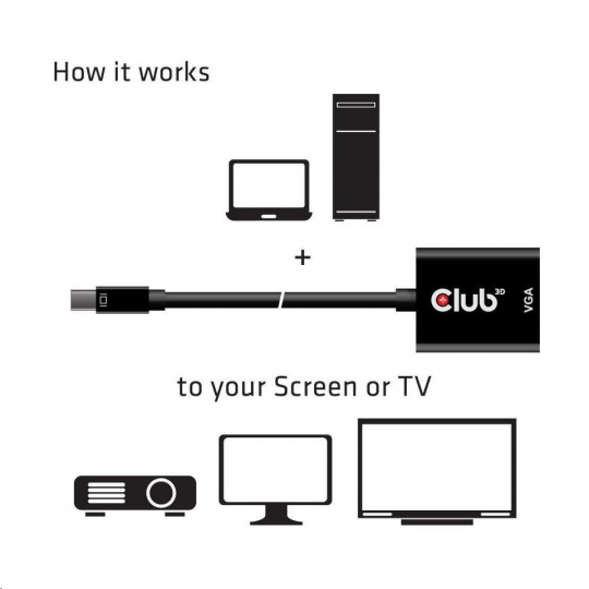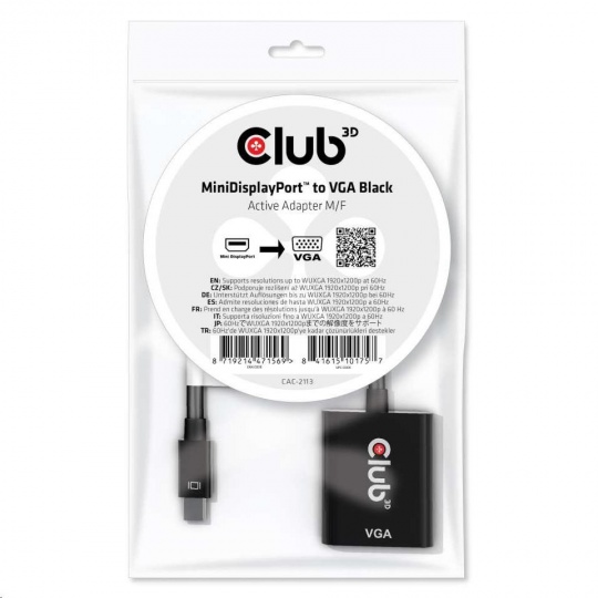 Club 3D CAC-2113 je aktívny prevodník signálu MiniDisplayPort™ na VGA. Umožňuje pripojiť analógové televízory VGA, monitory alebo projektory k stolnému počítaču alebo notebooku s výstupom MiniDisplayPort™. Adaptér ponúka bezproblémovú funkciu plug and play, takže nie je potrebná inštalácia ovládača a je napájaný z výstupu MiniDisplayPort™. Rozhranie MiniDisplayPort™ v adaptéri pozostáva z dvoch hlavných pruhov pre údaje DP, kanál AUX, signál HPD a napájanie. Výstup VGA je v súlade so štandardom VSIS a podporuje časovanie RB až do WUXGA. Podporuje rozlíšenie až do WUXGA 1920x1200p pri 60 Hz.Adaptér spolupracuje s grafickými riešeniami AMD, Nvidia a Intel.