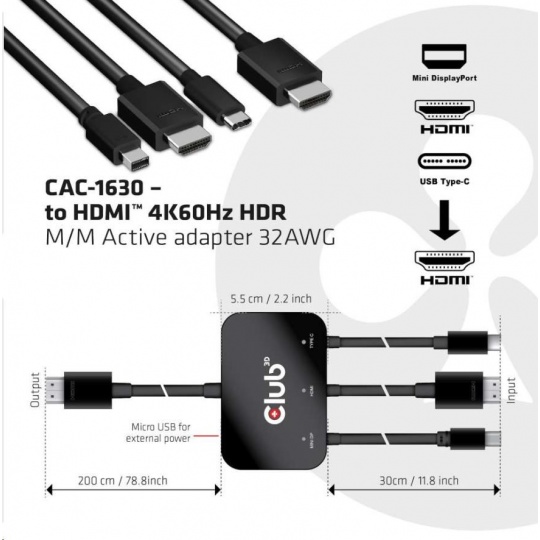Club3D Active USB Type-C + Mini DP adaptér 1.2+ HDMI na HDMI 4K60Hz HDR, M/M, 32AWG