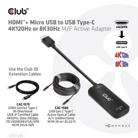 | In the box | - CAC-1336 HDMI™+ Micro USB to USB Type-C 4K120Hz or 8K30Hz M/F Active Adapter - USB Type-A to Micro USB M/M 1m / 3.28 ft cable for powering the adapter |