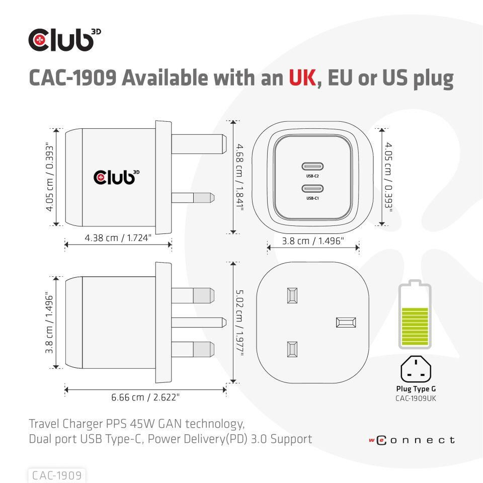 The Club3D CAC-1909 Travel Charger PPS 45W GAN technology, Dual port USB Type-C, Power Delivery(PD) 3.0 Support. Compact size & Superior Performance: GAN technology chipset makes this charger 50% smaller than traditional 45W charger, small enough to carry anywhere. The Programmable Power Supply(PPS) 45W wall charger match a variety of PD devices from smart phones to laptops, one for all making charging simple. This wide compatibility charger will be your convenient companion during your business trip or vacation. The Power Charger is light weight without compromising on Quality and safety. By adopting Power Delivery(PD) charging technology, this versatile Power Charger provides you with charging function through Dual USB Type-C interface, you can charge any connected Mobilephone / Tablet / NoteBook. Furthermore all it needs is a free USB Type-C port on your Dock/NoteBook/Tablet/ Mobile phone to be charged via the bundled USB cable.