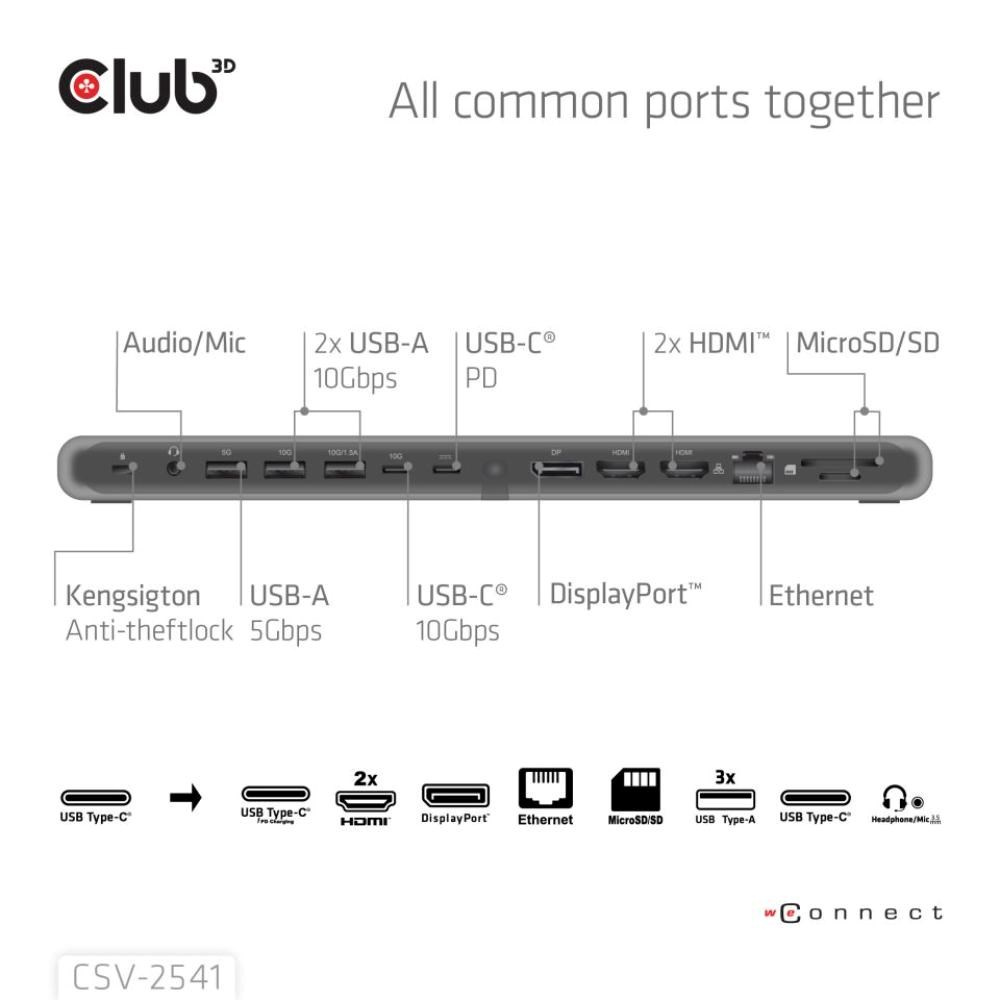 CSV-2541 je dokovacia stanica USB Type-C 10Gb/s 12 v 1 s trojitým displejom, 2x HDMI, 1x DisplayPort, 1x dátový port USB Type-C, 3x USB Type-A, RJ45, čítačka kariet, 3,5mm audio port a nabíjací port USB Type-C, ktorá predstavuje ideálne riešenie pre rozšírenie hostiteľského počítača USB Type-C alebo Thunderbolt, najmä pre hostiteľov s jediným portom USB Type-C. Vďaka konštrukcii s dolným držiakom môže byť stabilným stojanom pre vaše notebooky. Dodáva sa so 100W nabíjačkou a kábla, ktorý je súčasťou balenia.