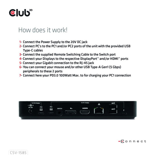 Club 3D CSV-1585 je MST dockovacia stanica s duálnym (HDMI+DP) displejom s funkciou KVM. Dva USB Type-C vstupy pre pripojenie dvoch rôznych hostiteľov na rýchle zvýšenie produktivity medzi dvomi hostiteľmi, stačí jedno kliknutie na horné tlačidlo alebo kliknutím na tlačidlo diaľkového ovládača pripojeného kábla. 3xUSB Type-A+3xUSB Type-C poskytujú dostatočné pripojenie pre externé zariadenia s prenosom dát až 5Gbps. 120W jednosmerným zdrojom napájania poskytuje 65W nabíjanie (PD) pre nabíjanie vášho notebooku USB Type-C alebo hostiteľských zariadení. Kompatibilné s akýmkoľvek zariadením podporujúcim režim DP Alt Mode s portom USB Type-C, ako je notebook, stolný počítač, tablet, telefón atď. Podpora nabíjania pomocou portov PC1 a PC2, stlačením tlačidla POWER SWITCH prepnete vstupné napájanie. Použite 20V/6A 120W DC napájací adaptér na napájanie dockovacej stanice, medzi 65W nabíjaním pre hostiteľa PC2 súčasne. Externé napájanie pre PC1 cez port USB Type-C1, výkon nabíjania závisí od adaptéra PD. So zámkom Kensington. Zapoj a hraj.