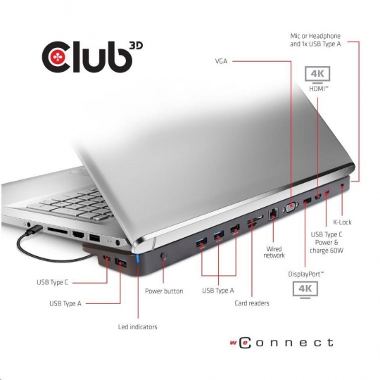 | Dostupné rozhrania | 3x USB 3.2 samica typu C Gen1 (1 pre dáta, 1 pre nabíjanie PD, 1 pre pripojenie k hostiteľovi) 3x USB 3.0 samica typu A 2x USB 2.0 Typ A samica 1x HDMI™ samica 1x DisplayPort™ samica 1x VGA samica 1x RJ45 konektor 1x SD slot 1x Micro SD slot 1x 3.5 mm stereo jack (slúchadlá/mikrofón) |