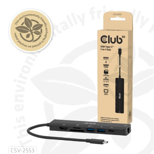 Club 3D CSV-2553 je USB-C, rozbočovač 7 v 1 s HDMI, 2x USB, RJ45, slotmi pre karty microSD/SD a portom USB-C samice, ktorý predstavuje ideálne riešenie na rozšírenie USB-C alebo Thunderbolt 3 (PC/laptop/tablet/mobilný telefón atď.) špeciálne pre hostiteľov s jediným portom USB-C.