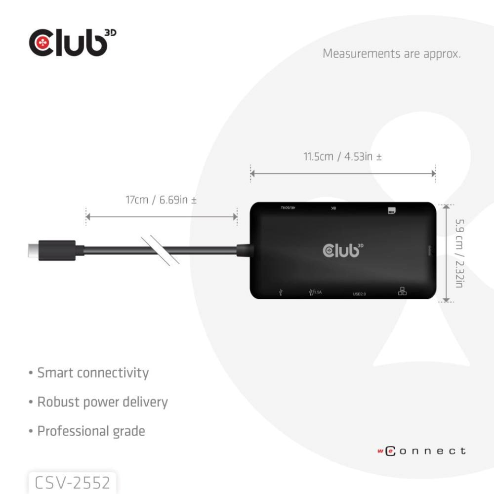 Club 3D CSV-2552 je rozbočovač USB-C® 9-1 s duálnym HDMI™, 2x USB-A, 1x USB-C® dáta, RJ45, sloty pre karty Micro SD/SD a nabíjacím portom USB-C®, ktorý predstavuje ideálne riešenie na rozšírenie portu USB-C® alebo Thunderbolt hostiteľa (PC/laptop/mobilný telefón atď.), najmä pre hostiteľa s jediným portom USB-C.