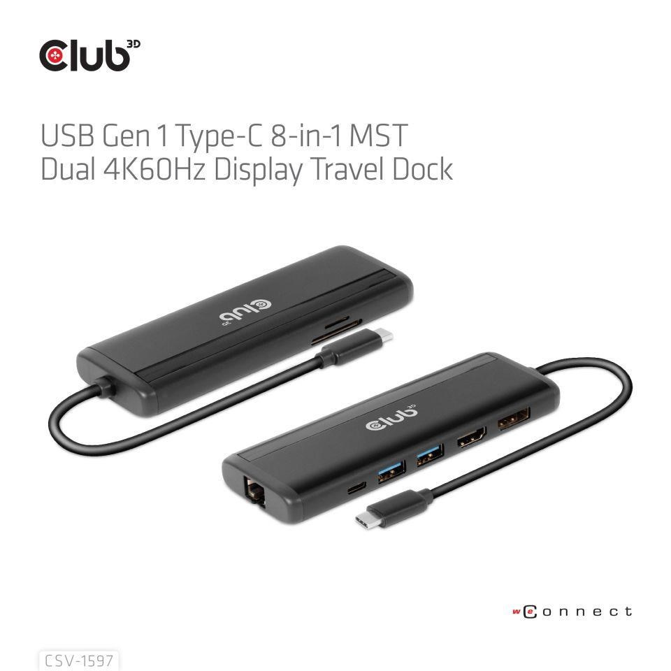 The Club 3D CSV-1597 USB Gen 1 Type-C 8-in-1 MST Dual 4K60Hz Display Travel Dock with HDMI™ 8K30Hz(HDR), DisplayPort™ 8K30Hz, 2x USB Gen 1 Type-A, BC1.2, RJ45, SD/Micro SD card slots and USB Gen 1 Type-C PD3.0 Female port, provides a very advanced, efficient solution to extend a single USB Gen 1 Type-C port to be multiple ports. It integrates video, data and power ports that allows to connect 2 displays simultaneously for enjoying videos on a larger screen, connect multiple USB Gen 1 devices for data transmission up to 5Gbps, connect a Gigabit Ethernet source for getting your PC connected to super high speed network, or connect to headset to enjoy fantastic music. It also provides PD charging for support up to max. 100W PD charging. This is for operating this device and charge the host simultaneously. It can work on all DP™1.4 Alt mode supported USB Gen 1 Type-C hosts.