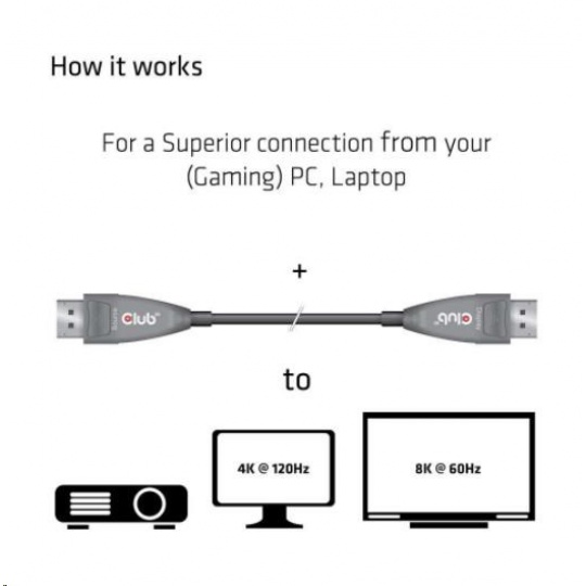 Club 3D CAC-1079 je aktívny optický jednosmerný kábel DisplayPort™, ktorý umožňuje podporu 8.1 Gb/s na kanál. Podporuje rozlíšenie 4K pri 120 Hz, ako aj 8K pri 60 Hz a formáty HDR. Tento kábel s optickými vláknami možno použiť na prenos audio a video signálov na vonkajších displejoch, LED tabuliach, displejoch domáceho kina, konferenčných miestnostiach, lekárskych zobrazovacích zariadeniach alebo bezpečnostných systémoch.