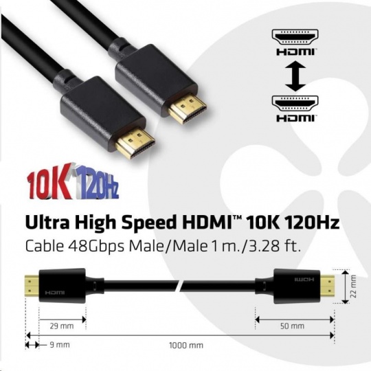Názov produktu: Club3D HDMI kábel 2.1 Ultra High Speed 4K 8K60Hz 48Gbps (M/M), 1m