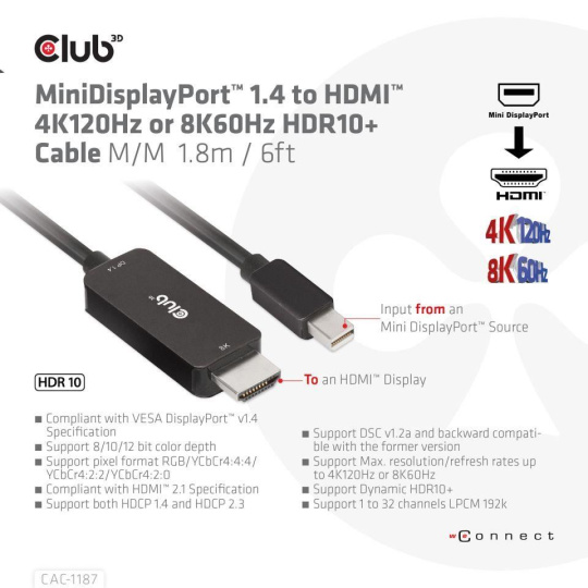 | In the box | • CAC-1187 MiniDisplayPort™ 1.4 to HDMI™ 4K120Hz or 8K60Hz HDR10+ Cable M/M 1.8m / 6ft |