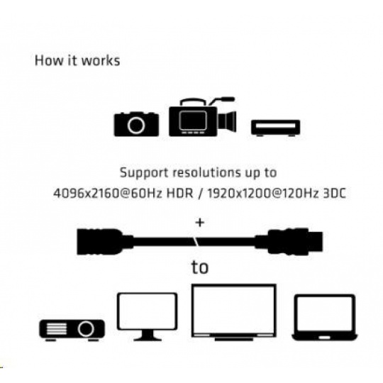 | - Kvalitný vysokorýchlostný predlžovací kábel HDMI™, 26 AWG. - V súlade s HDMI™ 1.3 / 1.4 / 2.0 štandard - rýchlosť prenosu dát až 18 Gb/s. - Podporuje rozlíšenie až do 4096x2160@60Hz HDR / 1920x1200@120Hz 3D. * - Produkt je plne plug & play a nevyžaduje externé napájanie. * Funkčnosť závisí aj od použitého kábla HDMI™ M/M. V kombinácii s týmto predlžovacím káblom CAC-1325 odporúčame použiť kábel HDMI Male/Male kvality 28AWG, ako napríklad Club 3D CAC-1371/CAC-1372 a/alebo CAC-1373 |