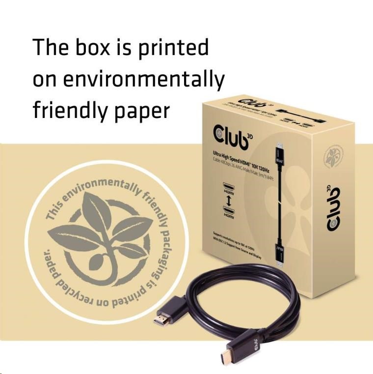 CAC-1373 - Ultra vysokorýchlostný HDMI™ kábel Club 3D je skonštruovaný tak, aby zvládol najvyššiu kvalitu video a audio signálov. HDMI™ má zvýšenú šírku pásma 48 Gb/s. Zvýšenie maximálnej šírky pásma v porovnaní s predchádzajúcimi verziami sa dosiahlo zvýšením prenosovej rýchlosti dátových kanálov (zo 6 Gb/s na 12 Gb/s) a počtu kanálov (z 3 na 4). To umožňuje podporu rozlíšení až do 10K pri 120 Hz!