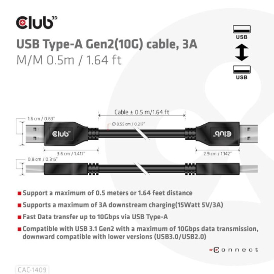 Kábel Club 3D CAC-1409 USB Typ-A Gen2(10G), 3A M/M je USB Typ-A kábel s dĺžkou 0,5 m. Je kompatibilný s USB 3.1 Gen 2 s maximálnou rýchlosťou 10 Gb/s prenosu dát a podporuje až 15W nasledovného nabíjania. Je spätne kompatibilný s nižšími verziami, prosím, majte na pamäti, že špecifikácie budú obmedzené na pripojené zariadenie.