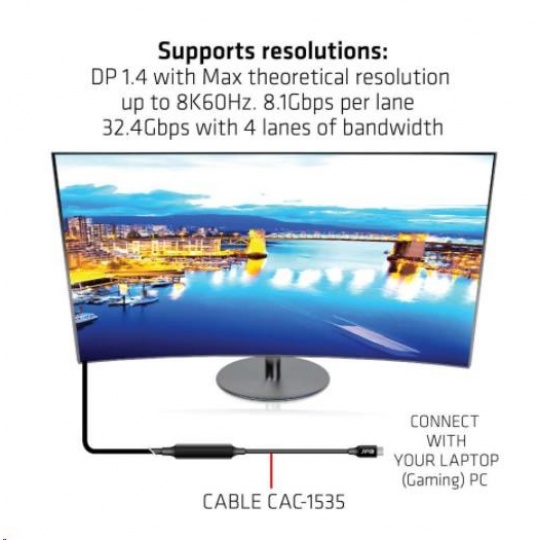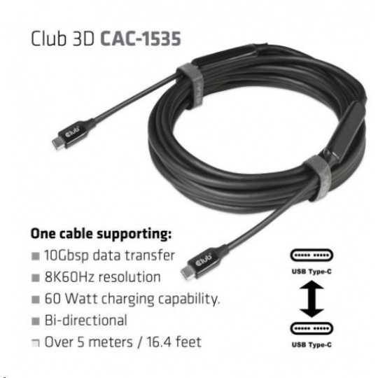 Club 3D CAC-1535 je obojsmerný aktívny kábel z USB typu C na USB typu C s čipovou sadou Re-timer na zlepšenie videa, dát a napájania, ktorý dosahuje dĺžku až 5 metrov/16.40ft . Pre video je kompatibilný s DP1.4 štandardov s teoretickým rozlíšením až 8K@60Hz. Pre dáta je kompatibilný s USB3.2 Gen 2 s maximálnou rýchlosťou prenosu dát 10 Gb/s a v prípade napájania je schopný dodať maximálne 60 W (20 V/3 A) PD Charging.