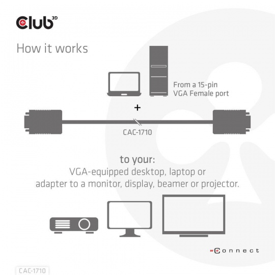 Club 3D CAC-1710 VGA kábel obojsmerný M/M 10m/32.8ft 28AWG spája akýkoľvek stolný počítač, notebook alebo adaptér vybavený VGA s monitorom, displejom, žiaričom alebo projektorom s 15-pinovým portom VGA Female. Kábel je ideálny na použitie doma alebo v práci, vytvára spoľahlivé pripojenie na čokoľvek od hrania hier až po premietanie videa a podporuje rozlíšenie Full HD 1080p (max. rozlíšenie 1920 x 1080).