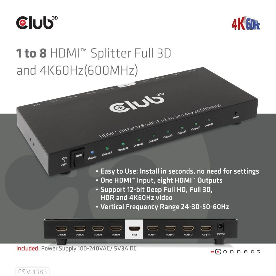 Club 3D CSV-1383 je vysoko výkonný a malý 1 až 8 HDMI™ Ultra High Definition Splitter s hot plug a železným puzdrom. Distribuuje vstup signálu HDMI™ do ôsmich identických výstupov súčasne. Poskytuje vysoko výkonný audio a video výstup prostredníctvom káblov HDMI™ až do rozlíšenia 4K@60Hz a je schopný prijímať a prenášať šírku pásma až 6Gbps/600MHz.