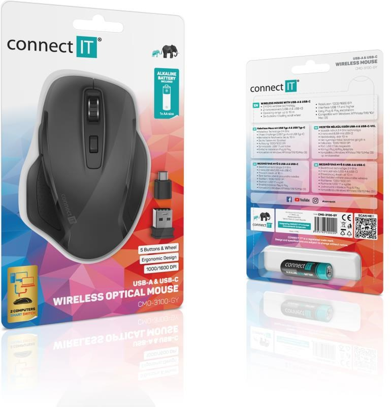 CONNECT IT Dual SmartSwitch bezdrátová myš, USB-A + C (+1x AA baterie zdarma), šedá