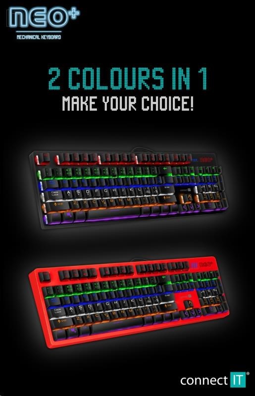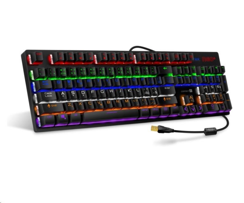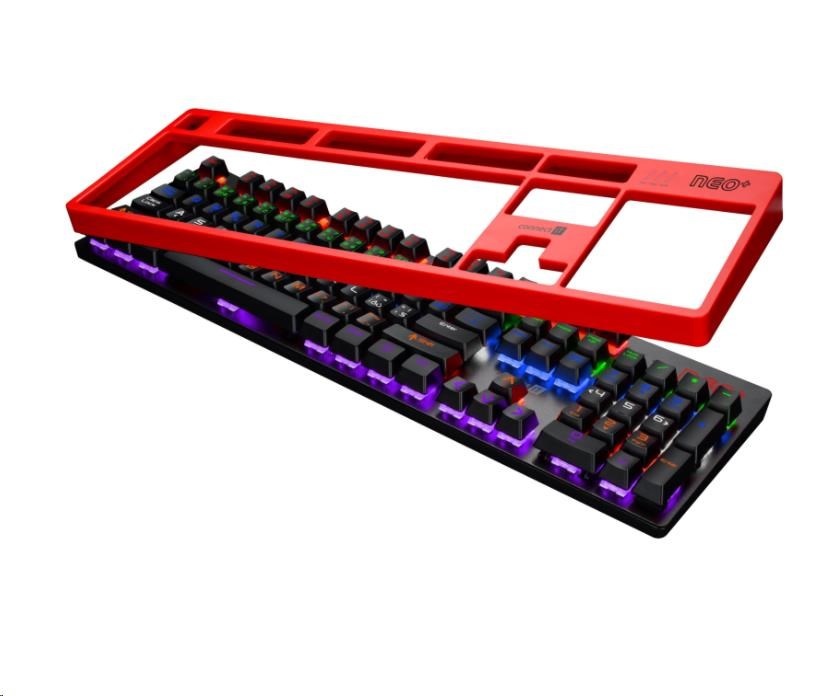 Profesionálna mechanická klávesnica radu NEO+ pre hráčov počítačových hier v českom a slovenskom rozložení s celkom 22 režimami farebného dúhového podsvietenia a päťstupňovou reguláciou intenzity podsvietenia. K dispozícii je 12 multimediálnych tlačidiel.