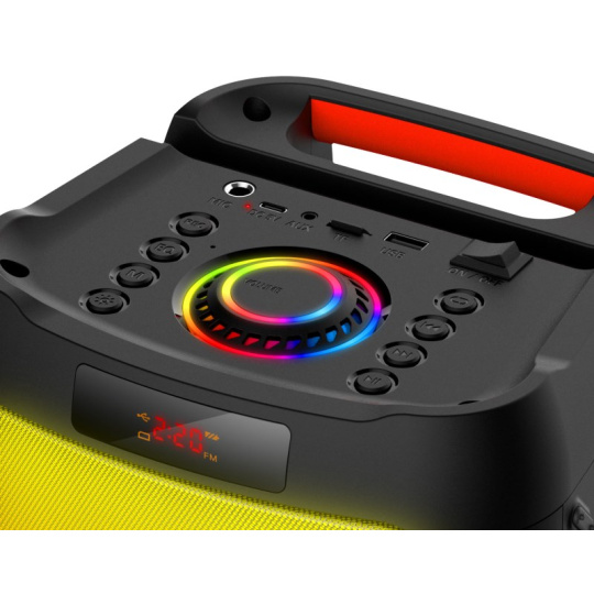 V hornej časti reproduktora sa nachádzajú všetky potrebné ovládacie tlačidlá a nechýba ani vestavený mikrofón s funkciou hlasitého hands-free na uskutočňovanie telefónnych hovorov - stačí prijať hovor a hlas volajúceho počujete priamo v reproduktore. Vďaka dodávanému externému mikrofónu a KARAOKE funkciám na diaľkovom ovládači si užijete veľa zábavy s priateľmi. Batéria s kapacitou 4500 mAh zabezpečí až 10 hodín prehrávania a je možné ju nabiť pomocou dodávaného USB-C kábla z akéhokoľvek USB nabíjačky alebo power banky.