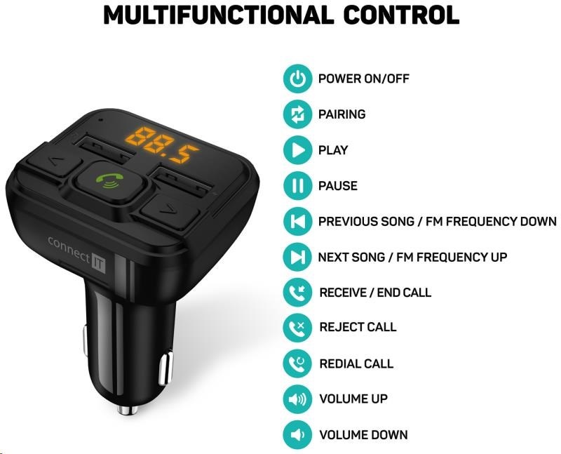 Bluetooth vysielač v kombinácii s dvojportovou nabíjačkou je multifunkčné zariadenie do vášho auta, vďaka ktorému môžete nielen nabíjať mobilné zariadenia, ale aj počúvať hudbu zo svojho USB flash disku alebo mobilného telefónu. Vysielač je vybavený digitálnym displejom a tromi ovládacími tlačidlami pre jednoduché a komfortné ovládanie všetkých funkcií. Navyše je možné pripojiť aj pamäťovú Micro SD kartu. Samozrejmosťou pre toto zariadenie je aj možnosť bezdrôtového spárovania s vaším mobilným telefónom na uskutočňovanie telefónnych hovorov. Na tento účel je zabudovaný aj mikrophone.