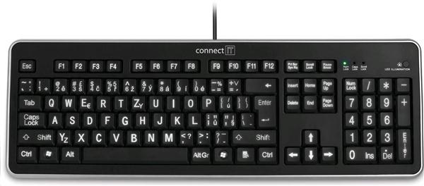 Novú klávesnicu CONNECT IT s LED podsvietením a veľkým písmom ocenia nielen používatelia so slabším zrakom, ale aj všetci, ktorí pracujú v tme a vo večerných hodinách. Čierna povrchová úprava so strieborným lemovaním dodáva klávesnici elegantný vzhľad. Vlastnosti: - české rozloženie kláves - veľké písmo kláves pre pohodlné písanie - biele LED podsvietenie pre použitie za svetla aj v tme - tlačidlo na vypnutie podsvietenia - matný povrch klávesnice - kompatibilná s USB 1.1 a 2.0 - dĺžka kábla: 140 cm..