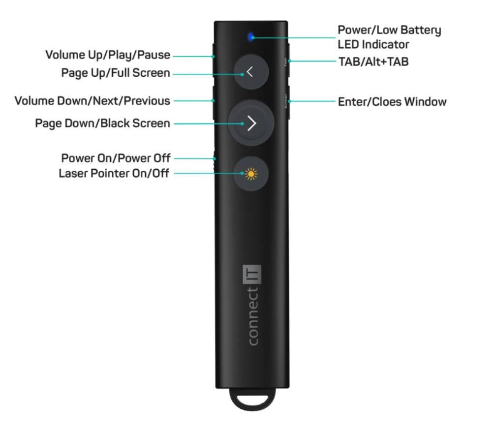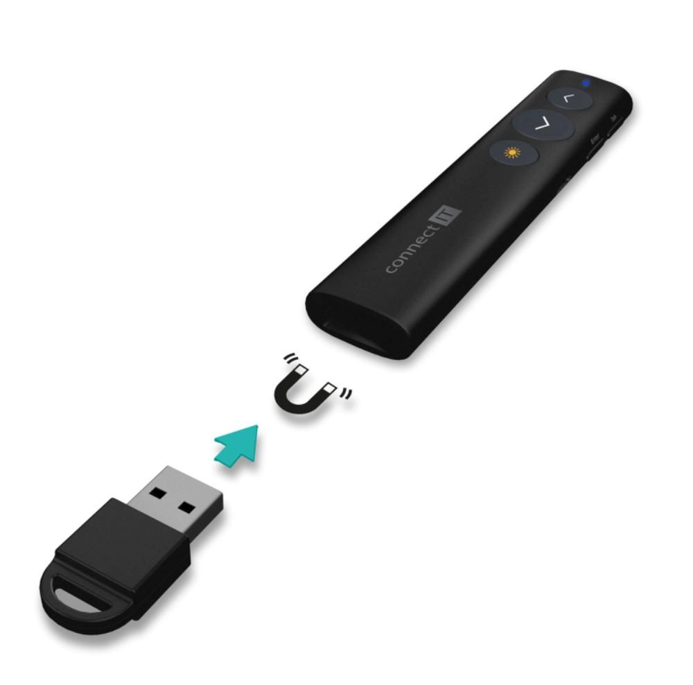 Optimálna kombinácia bezdrôtového prezentéra a laserového ukazovátka z vás urobí profesionála na akejkoľvek porade, prednáške alebo prezentácii. Zamilujete si ho vďaka jeho nízkej hmotnosti a dokonalému štíhlemu tvaru padnucemu do každej ruky. V zadnej časti sa nachádza praktická schránka na USB prijímač, ktorý už nikdy neztratíte.